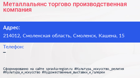 Металлальянс, торгово-производственная компания по адресу 214012, Смоленская область, Смоленск, Кашена, 15 в дальнейшем Организация, размещена в следующих категориях: