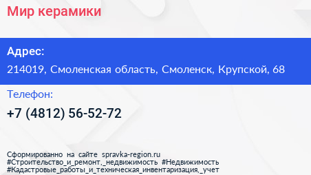 Мир керамики по адресу 214019, Смоленская область, Смоленск, Крупской, 68 в дальнейшем Организация, размещена в следующих категориях: