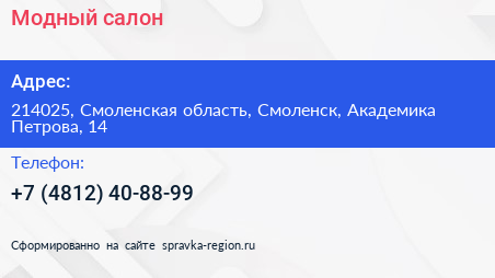 Модный, салон по адресу 214025, Смоленская область, Смоленск, Академика Петрова, 14 в дальнейшем Организация, размещена в следующих категориях: