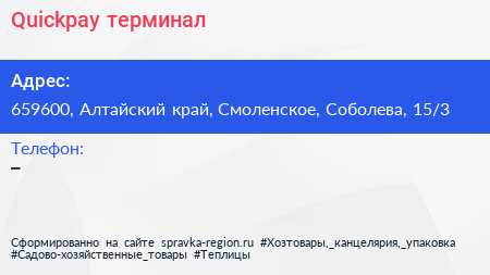 Quickpay, терминал по адресу 659600, Алтайский край, Смоленское, Соболева, 15/3 в дальнейшем Организация, размещена в следующих категориях: