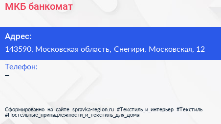 МКБ, банкомат по адресу 143590, Московская область, Снегири, Московская, 12 в дальнейшем Организация, размещена в следующих категориях: