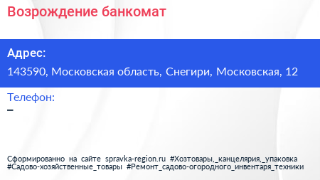 Возрождение, банкомат по адресу 143590, Московская область, Снегири, Московская, 12 в дальнейшем Организация, размещена в следующих категориях: