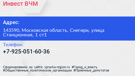 Инвест ВЧМ по адресу 143590, Московская область, Снегири, улица Станционная, 1 ст1 в дальнейшем Организация, размещена в следующих категориях: