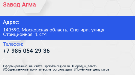 Завод Агма по адресу 143590, Московская область, Снегири, улица Станционная, 1 ст4 в дальнейшем Организация, размещена в следующих категориях: