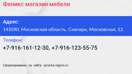 Феникс, магазин мебели по адресу 143590, Московская область, Снегири, Московская, 12 в дальнейшем Организация, размещена в следующих категориях: