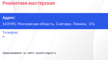 Ремонтная мастерская по адресу 143590, Московская область, Снегири, Ленина, 37а в дальнейшем Организация, размещена в следующих категориях: