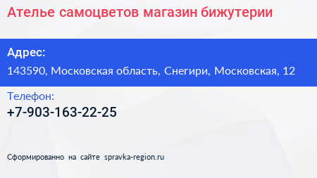 Ателье самоцветов, магазин бижутерии по адресу 143590, Московская область, Снегири, Московская, 12 в дальнейшем Организация, размещена в следующих категориях: