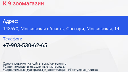К-9, зоомагазин по адресу 143590, Московская область, Снегири, Московская, 14 в дальнейшем Организация, размещена в следующих категориях: