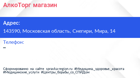 АлкоТорг, магазин по адресу 143590, Московская область, Снегири, Мира, 14 в дальнейшем Организация, размещена в следующих категориях: