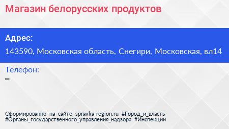 Магазин белорусских продуктов по адресу 143590, Московская область, Снегири, Московская, вл14 в дальнейшем Организация, размещена в следующих категориях: