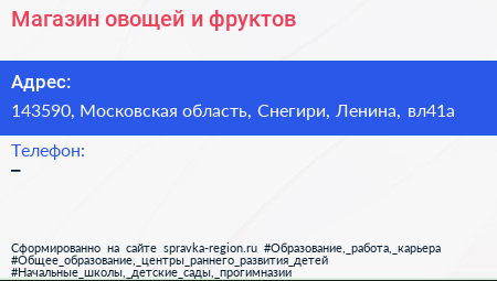 Магазин овощей и фруктов по адресу 143590, Московская область, Снегири, Ленина, вл41а в дальнейшем Организация, размещена в следующих категориях: