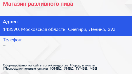 Магазин разливного пива по адресу 143590, Московская область, Снегири, Ленина, 39а в дальнейшем Организация, размещена в следующих категориях: