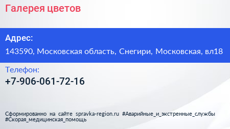 Галерея цветов по адресу 143590, Московская область, Снегири, Московская, вл18 в дальнейшем Организация, размещена в следующих категориях:
