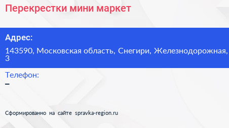 Перекрестки, мини-маркет по адресу 143590, Московская область, Снегири, Железнодорожная, 3 в дальнейшем Организация, размещена в следующих категориях: