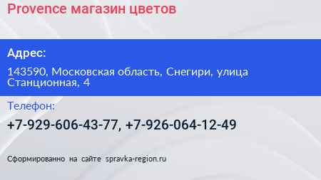 Provence, магазин цветов по адресу 143590, Московская область, Снегири, улица Станционная, 4 в дальнейшем Организация, размещена в следующих категориях: