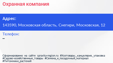 Охранная компания по адресу 143590, Московская область, Снегири, Московская, 12 в дальнейшем Организация, размещена в следующих категориях: