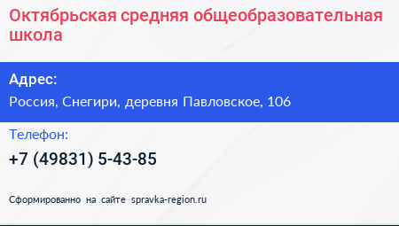 Октябрьская средняя общеобразовательная школа по адресу Октябрьская СОШ, Центральная кольцевая автомобильная дорога, Павловское, городской округ Истра, Московская область, Центральный федеральный округ, 143541, Россия в дальнейшем Организация, размещена в следующих категориях: