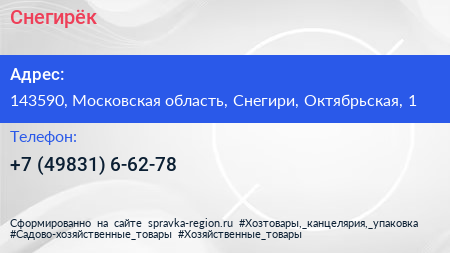 Снегирёк по адресу 143590, Московская область, Снегири, Октябрьская, 1 в дальнейшем Организация, размещена в следующих категориях: