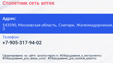 Столетник, сеть аптек по адресу 143590, Московская область, Снегири, Железнодорожная, 3 в дальнейшем Организация, размещена в следующих категориях:
