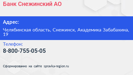 Банк Снежинский, АО по адресу Челябинская область, Снежинск, Академика Забабахина, 19 в дальнейшем Организация, размещена в следующих категориях: