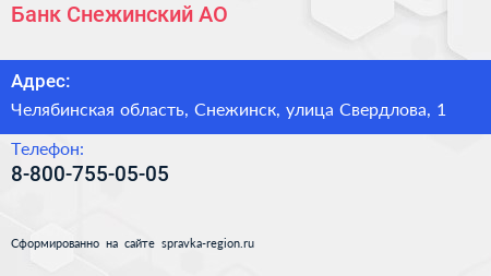 Банк Снежинский, АО по адресу Челябинская область, Снежинск, улица Свердлова, 1 в дальнейшем Организация, размещена в следующих категориях: