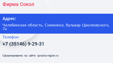 Фирма Сокол по адресу Челябинская область, Снежинск, бульвар Циолковского, 7а в дальнейшем Организация, размещена в следующих категориях: