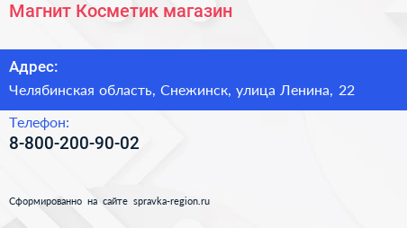Магнит Косметик, магазин по адресу Челябинская область, Снежинск, улица Ленина, 22 в дальнейшем Организация, размещена в следующих категориях:
