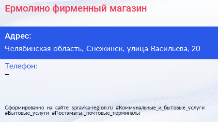 Ермолино, фирменный магазин по адресу Челябинская область, Снежинск, улица Васильева, 20 в дальнейшем Организация, размещена в следующих категориях: