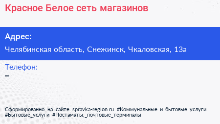 Красное & Белое, сеть магазинов по адресу Челябинская область, Снежинск, Чкаловская, 13а в дальнейшем Организация, размещена в следующих категориях: