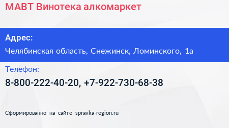 МАВТ-Винотека, алкомаркет по адресу Челябинская область, Снежинск, Ломинского, 1а в дальнейшем Организация, размещена в следующих категориях: