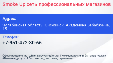 Smoke Up, сеть профессиональных магазинов по адресу Челябинская область, Снежинск, Академика Забабахина, 15 в дальнейшем Организация, размещена в следующих категориях: