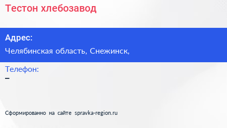 Тестон, хлебозавод по адресу Челябинская область, Снежинск, в дальнейшем Организация, размещена в следующих категориях: