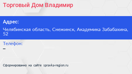 Торговый Дом Владимир по адресу Челябинская область, Снежинск, Академика Забабахина, 52 в дальнейшем Организация, размещена в следующих категориях: