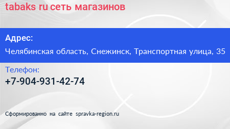 tabaks.ru, сеть магазинов по адресу Челябинская область, Снежинск, Транспортная улица, 35 в дальнейшем Организация, размещена в следующих категориях: