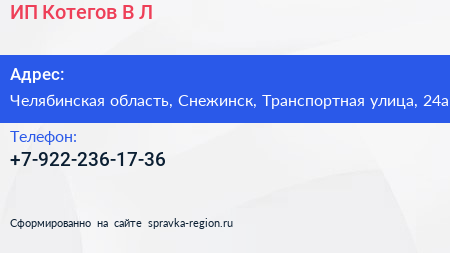 ИП Котегов В.Л. по адресу Челябинская область, Снежинск, Транспортная улица, 24а в дальнейшем Организация, размещена в следующих категориях: