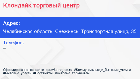 Клондайк, торговый центр по адресу Челябинская область, Снежинск, Транспортная улица, 35 в дальнейшем Организация, размещена в следующих категориях: