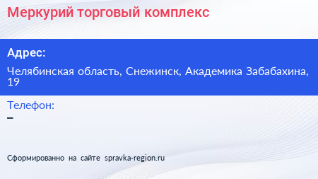 Меркурий, торговый комплекс по адресу Челябинская область, Снежинск, Академика Забабахина, 19 в дальнейшем Организация, размещена в следующих категориях: