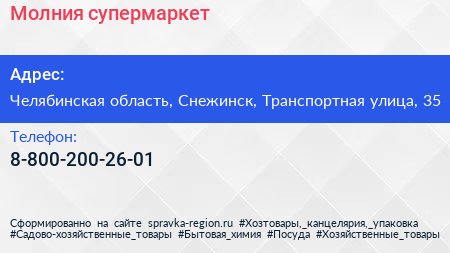 Молния, супермаркет по адресу Челябинская область, Снежинск, Транспортная улица, 35 в дальнейшем Организация, размещена в следующих категориях: