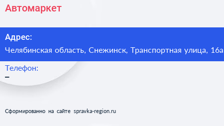 Автомаркет+ по адресу Челябинская область, Снежинск, Транспортная улица, 16а в дальнейшем Организация, размещена в следующих категориях: