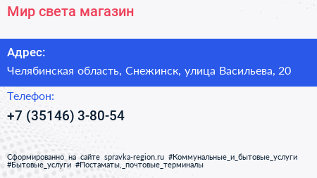 Мир света, магазин по адресу Челябинская область, Снежинск, улица Васильева, 20 в дальнейшем Организация, размещена в следующих категориях: