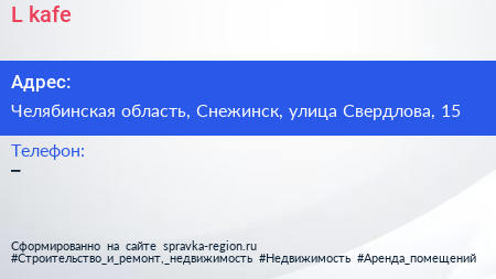 L kafe по адресу Челябинская область, Снежинск, улица Свердлова, 15 в дальнейшем Организация, размещена в следующих категориях: