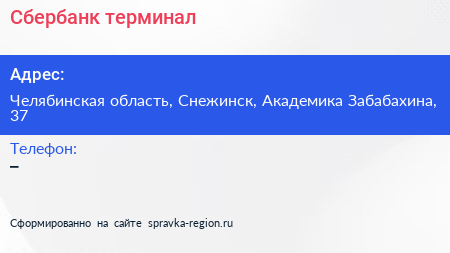 Сбербанк, терминал по адресу Челябинская область, Снежинск, Академика Забабахина, 37 в дальнейшем Организация, размещена в следующих категориях:
