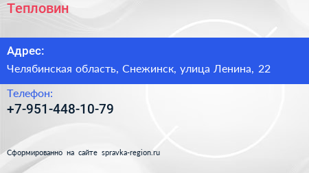 Тепловин по адресу Челябинская область, Снежинск, улица Ленина, 22 в дальнейшем Организация, размещена в следующих категориях: