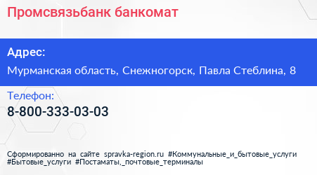 Промсвязьбанк, банкомат по адресу Мурманская область, Снежногорск, Павла Стеблина, 8 в дальнейшем Организация, размещена в следующих категориях: