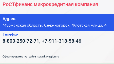 РоСТфинанс, микрокредитная компания по адресу Мурманская область, Снежногорск, Флотская улица, 4 в дальнейшем Организация, размещена в следующих категориях: