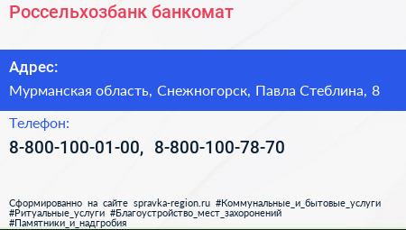 Россельхозбанк, банкомат по адресу Мурманская область, Снежногорск, Павла Стеблина, 8 в дальнейшем Организация, размещена в следующих категориях: