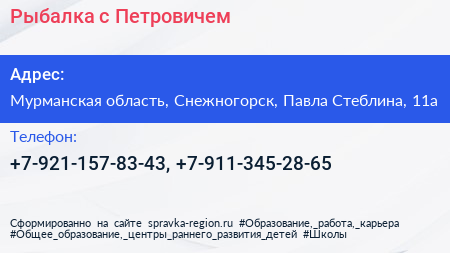 Рыбалка с Петровичем по адресу Мурманская область, Снежногорск, Павла Стеблина, 11а в дальнейшем Организация, размещена в следующих категориях: