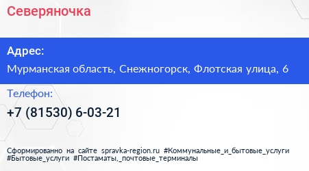 Северяночка по адресу Мурманская область, Снежногорск, Флотская улица, 6 в дальнейшем Организация, размещена в следующих категориях: