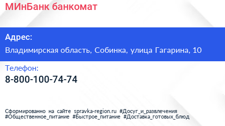 МИнБанк, банкомат по адресу Владимирская область, Собинка, улица Гагарина, 10 в дальнейшем Организация, размещена в следующих категориях: