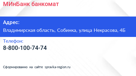 МИнБанк, банкомат по адресу Владимирская область, Собинка, улица Некрасова, 4Б в дальнейшем Организация, размещена в следующих категориях: